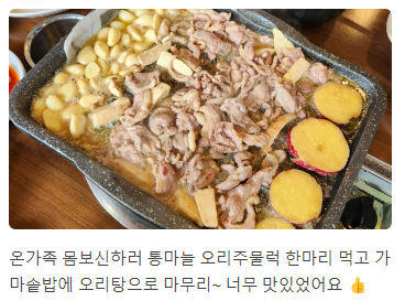 - 온 가족 몸보신하러 통마늘 오리주물럭 한 마리 먹고 가마솥밥에 오리탕으로 마무리했는데 너무 맛있습니다.