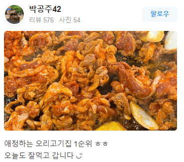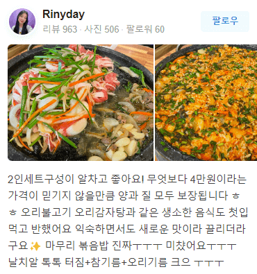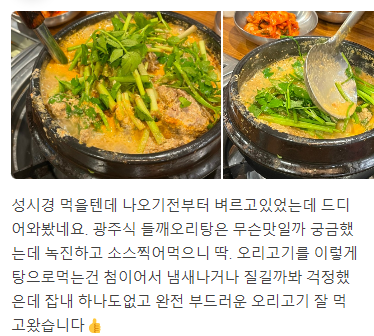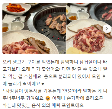 - 매장이 청결하고 오리고기랑 밑반찬 모두 깔끔하게 맛있어요!