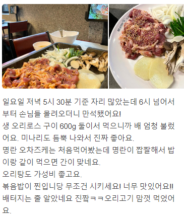 - 가성비 좋고 배 터지는 줄 알았네요 진짜 오리고기 맘껏 먹었어요.