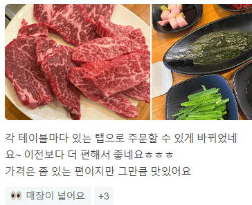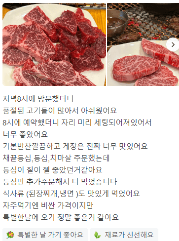 '큰집한우'는 최고등급 1++한우 등심과 안심을 사용하는 맛집입니다. 꽃등심은 특히 최고의 질을 유지하고 있어 예약이 필요합니다. 고기는 두툼하고 씹는 맛이 좋으며, 뻑뻑함이나 질김이 없어 육즙과 함께 즐길 수 있습니다. 명이나물에 싸서 먹으면 더욱 맛있게 느껴지며, 메추리알 간장조림 통을 함께 제공하여 무한리필로 장조림도 즐길 수 있습니다. 서울에서 강원도로 여행하는 사람들에게 인기가 있습니다.