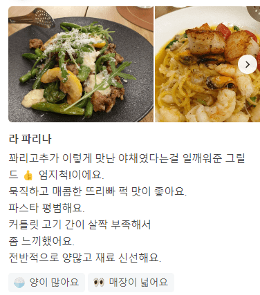 라파리나는 유기농 밀가루를 사용한 당일 생산 베이커리, 숙련된 바리스타가 내리는 커피, 이탈리아 식재료와 직접 뽑은 생면으로 만든 파스타, 나폴리 정통 화덕 피자를 즐길 수 있는 캐주얼 이탈리안 식당입니다. 단체석, 포장, 예약 서비스도 제공되며 무선 인터넷도 이용 가능합니다.