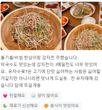 " 이 가격에 이 정도 코스면 진짜 너무 좋고, 효자동 맛집인 만큼 정말 맛있게 잘 먹었어요 "