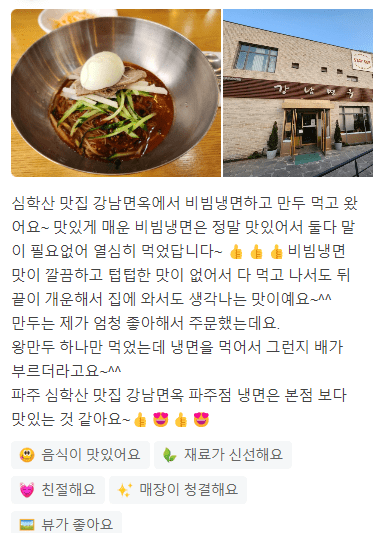 " 맛이 깔끔하고 텁텁한 맛이 없어서 개운하고 집에 와서도 생각나는 맛이에요. "